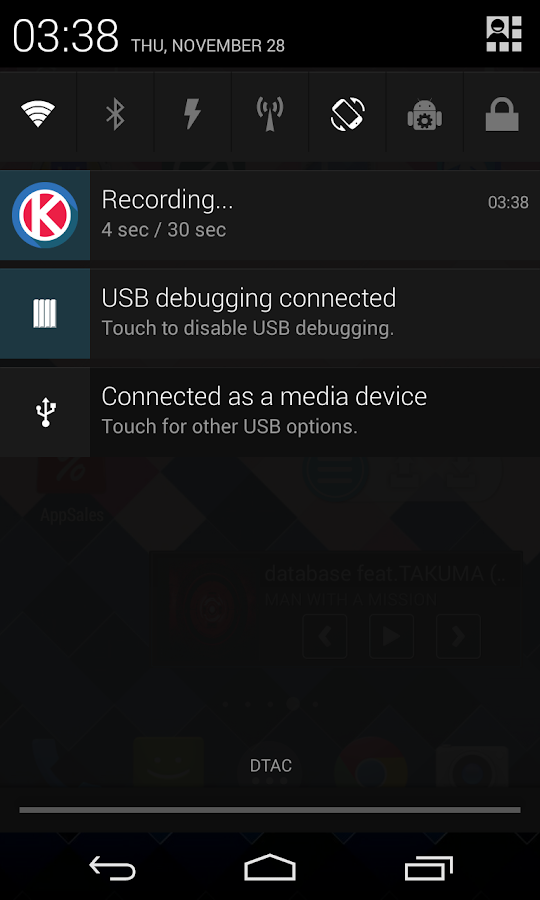 Gravando sua tela do dispositivo android no Android 4.4 (KitKat) que apoiou a gravação da tela. mas você precisa executar o comando shell do PC para gravar tela do dispositivo.